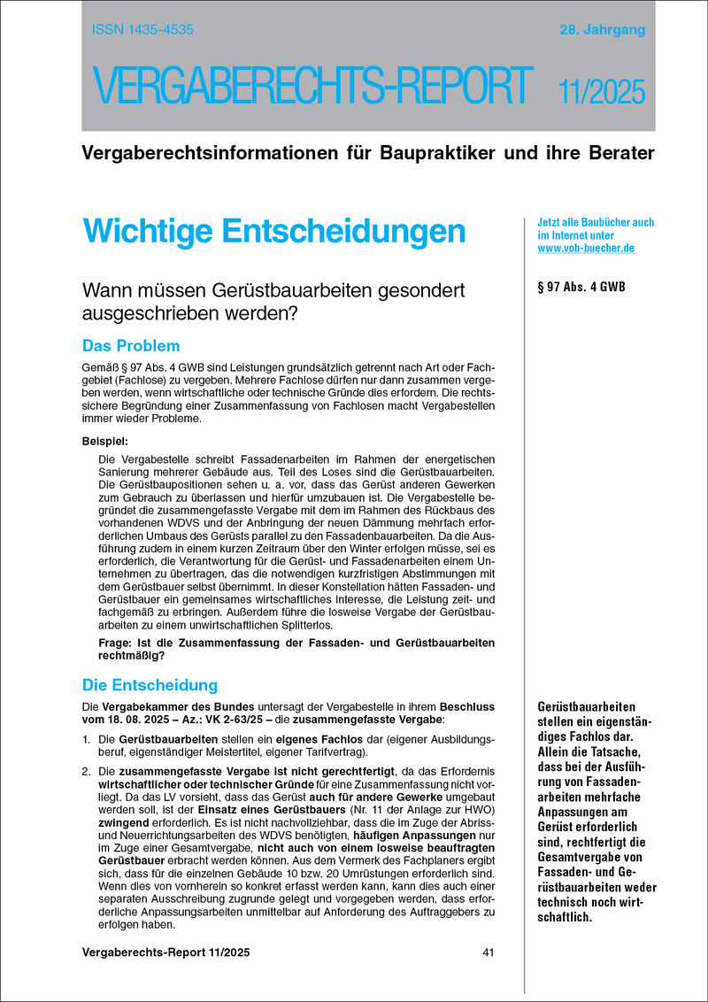 Das Vergaberecht bei öffentlichen Bauaufträgen wird immer wichtiger. Immer mehr Auftraggeber, Architekten, Bieter und ihre juristischen Berater müssen sich darüber informieren, ob Vergabeentscheidungen korrekt und ggf. Schadenersatzansprüche bei Verstößen denkbar sind. Der Vergaberechts-Report informiert über alle neuen Entwicklungen genauso praxisnah wie der Baurechts-Report.